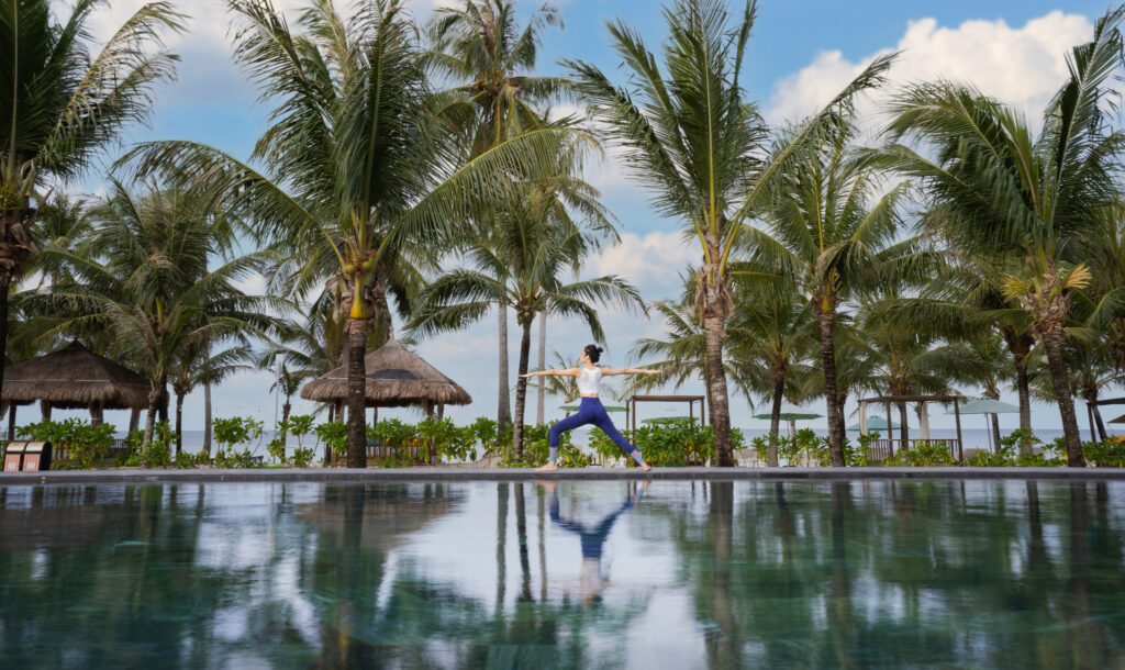 Bao quanh bởi cây xanh và ánh sáng tự nhiên dịu nhẹ, hồ bơi được thiết kế để tạo cảm giác kết nối trọn vẹn với thiên nhiên. Dù là buổi sớm tinh khôi hay ráng chiều lặng gió, từng khoảnh khắc tại đây đều mang lại cảm giác an yên và cân bằng – một trải nghiệm nghỉ dưỡng đúng nghĩa.